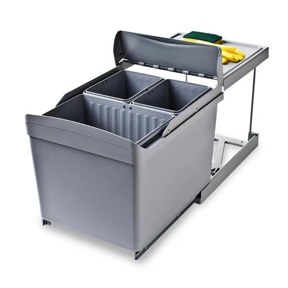 SCHÜTTE Abfalleimer, aluminiumfarben, Zum Sammeln von Müll in der Küche, Hand-Vollauszug, Mit praktischer 3-Fach-Trennung, 3 herausnehmbare Innenbehählter