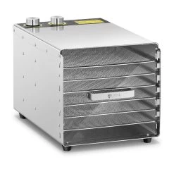 Seine kraftvollen 630 Watt lassen die heiße Luft durch einen geräuscharmen Ventilator gleichmäßig zwischen den 6 Etagen zirkulieren. Die Temperatur ist per Drehregler stufenlos bis 68 °C einstellbar. Mit einer Trockenfläche von insgesamt 0,65 m² ist die Zubereitung größerer Mengen gar kein Problem. Komplett aus gebürstetem Edelstahl gefertigt macht er nicht nur eine gute Figur, auch die Reinigung gestaltet sich kinderleicht.