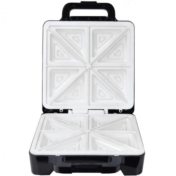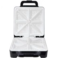 Sandwichmaker zum Backen von 4 leckeren Sandwiches Der Maker besitzt 2 große antihaftbeschichtete Backplatten aus Keramik. Der obere Teil ist in Senkrechtstellung und in 100° Stellung aufklappbar. Er kann dadurch zur besseren Befüllung & Reinigung arretiert werden. Durch die aufrechte Aufstellmöglichkeit lässt sich das Gerät platzsparend im Schrank verstauen. • Verriegelungssystem • 4 rutschfeste standüße • einfache Handhabung und Reinigung • Betriebskontrollleuchte und Bereitschaftsanzeige • Farbe: schwarz mit Edelstahlabdeckung • Maße ca. ( L x B x H): 36 x 29 x 11 cm • Plattengröße: 28,7 x 28 cm • Kabellänge: 75 cm • 220 Volt • 1600 Watt max. Power