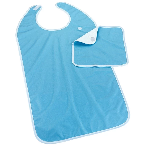 WENKO Schürze, Polyester, blau, Der praktische Helfer ist aus pflegeleichter Mikrofaser gefertigt und bei 60°C waschbar, Praktische Latzschürze hilft Kleidung beim Essen und Trinken vor unschönen Flecken zu bewahren, Einfach mit Klettverschluss um den Hals hängen, Speiseschürze aus pflegeleichter Mikrofaser, waschbar bis 60 °C, Rückseite der Schürze verfügt über eine Kunststoffbeschichtung